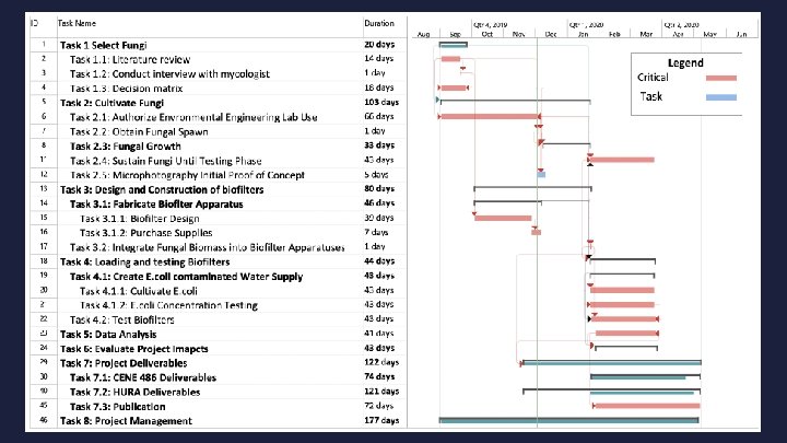 3. 0 Project Schedule Hours Task Name Senior Project Engineer in Lab Admin. Training Technician Assistant Total Hours Task 1 Select Fungi 4 8 19 0 0 31 Task 2: Cultivate Fungi Task 3: Design and Construction Of Biofilters 6 4 14 10 36 31 54 11 0 3 110 59 Task 4: Loading and Testing Biofilters 3 15 29 210 0 257 Task 5: Data Analysis 6 30 40 6 0 82 Task 6: Evaluate Project Imapcts 2 8 20 0 1 31 Task 7: Project Deliverables 15 39 85 0 17 156 Task 8: Project Management 19 45 31 0 36 130 Sum Of Hours Per Position 58 168 291 281 57 855 12
