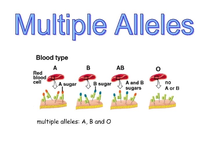 In traits with multiple alleles, each individual can carry any two of the several possible alleles. Ex. BLOOD TYPE The gene for blood type has 3 possible alleles. A, B, or O
