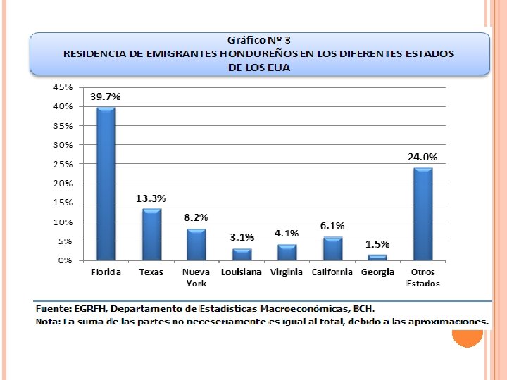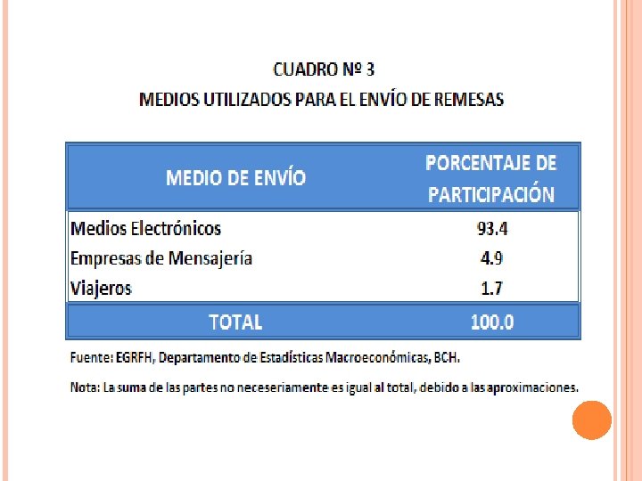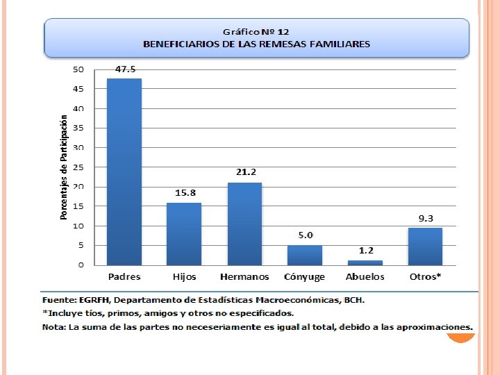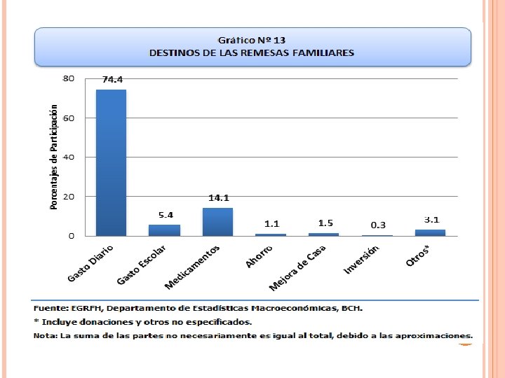 REMESAS: MIGRACION Y DESARROLLO En Honduras las remesas son la principal fuente de generación de divisas en el país por encima de las exportaciones de mercancías generales, de maquila y de turismo ( cifras del BCH) Financian los gastos de consumo, educación, vivienda, salud en la mayoría de los hogares El año 2010 alcanzaron US$ 2, 631. 000, Representan el 17. 1 del PIB del país A nivel centroamericano, Honduras es el tercer país receptor de remesas familiares