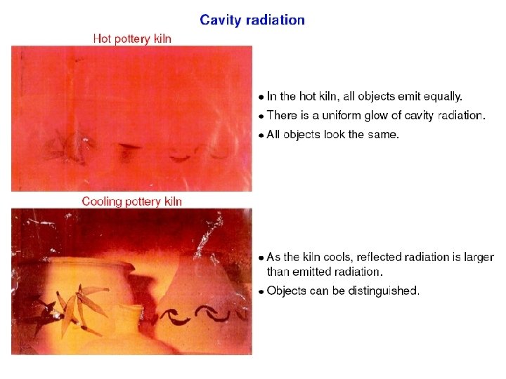 Basic Laws of Emission Consider an ‘isolated cavity’ and a hypothetical radiating body within it at temperature T. An equilibrium will exist between the radiation emitted from the body and the radiation that body receives from the walls of the cavity. The ‘equilibrium’ radiation inside the cavity is determined solely by the temperature of the body. This radiation is referred to as black-body radiation. Two black-bodies of the same temperature emit precisely the same amount of radiation - proof 2 nd law