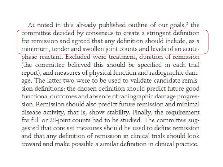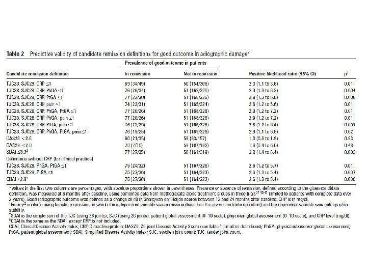 New ACR/EULAR RA remission criteria • Developed by committee using data from clinical trials • Assessed ability of candidate measures to predict: damage (change 0 in vd. H/S score) and function (change in HAQ 0; HAQ 0. 5) over 2 ys • Best results obtained by 2 proposed definitions: – TJC and SJC and CRP and Pt Global all 1 OR – SDAI 3. 3 • [SDAI = TJC (28) + SJC (28) + Phys global (0– 10 cm VAS) + Pt global (0– 10 cm VAS) + CRP (mg/d. L) Felson DT, et al. Ann Rheum Dis 2011
