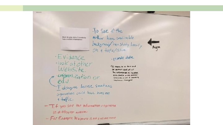Whiteboard Walk ● Supplies needed: Big pieces of paper or whiteboards, markers, prompts ● Time: Anywhere from 10 -30 minutes depending on your prompts ● Why: Place prompts in different areas, have groups rotate and respond to each prompt and any existing student answers, discuss