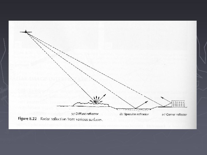 4. Reflectance ► Incidence angle - the angle between the axis of the incident radar signal and a perpendicular to the surface that the signal strikes ► Specular reflection ► Diffuse reflection ► Corner reflection