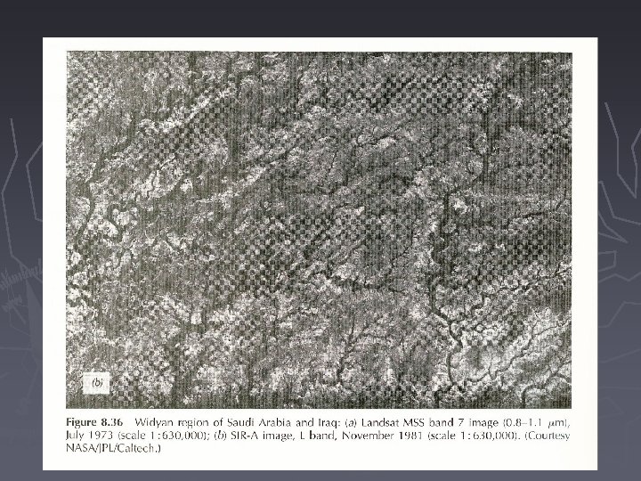 5. Radar Image Brightness ► Electrical characteristics - Complex Dielectric Constant: water 80, most material 3 -8 when dry - moisture content is more significant than material themselves in increasing reflectance - metal objects have high returns, e. g. metal bridges, silos