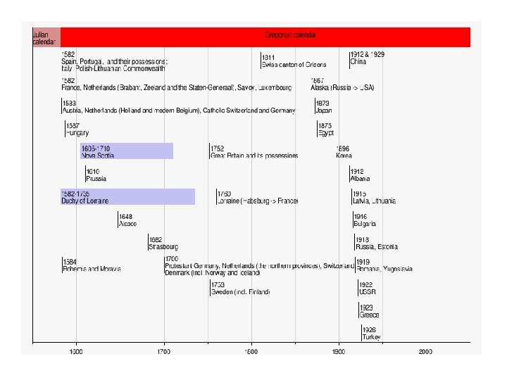 THE GREGORIAN CALENDAR • • • THE LENGTH OF THE TROPICAL YEAR IS 365. 242199 DAYS DIFFERS FROM THE JULIAN CALENDAR 365. 25 DAY YEAR BY ABOUT 11 MINUTES. IN MEDIEVAL EUROPE THE VERNAL EQUINOX WAS OCCURRING AS MANY AS 10 DAYS EARLY (AFFECTED THE DATE OF EASTER) IN 1582 POPE GREGORY ISSUED A PAPAL BULL ANNOUNCING THAT THE YEAR 1583 WOULD BEGIN A NEW CALENDAR (WHICH WE CALL THE GREGORIAN CALENDAR) – The last day of the Julian calendar was Thursday, 4 October 1582 and this was followed by the first day of the Gregorian calendar, Friday, 15 October 1582 (the cycle of weekdays was not affected). ENGLAND ITS COLONIES DIDN’T ADOPT THE GREGORIAN CALENDAR UNTIL 1752. BY THEN THE JULIAN CALENDAR HAD GOTTEN FARTHER OF TRACK SO THAT 11 DAYS HAD TO BE ADDED. – Wednesday, 2 September 1752 was followed by Thursday, 14 September 1752 GEORGE WASHINGTON WAS BORN ON FEBRUARY 11 , 1731. WITH CALENDAR REFORM IT BECAME FEBRUARY 22, 1731