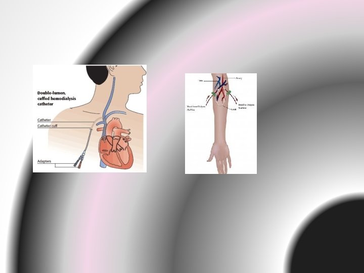 Components of Hemodialysis -Dialyzer or artificial kidney - Blood compartment -Dialysate – made up of clear H 2 O & chemicals. Prevent decrease in pt’s blood temperature. -Vascular access routes – AV fistula, AV Graft, Dual Lumen Cathater, AV Shunt. -Hemodialysis machine.