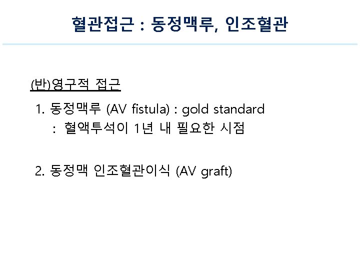 AV fistula Nondominat arm 에 시술 : 평소 혈관 아껴 야 Radiocephalic 이 기본 Maturation : 6~8 주 걸림