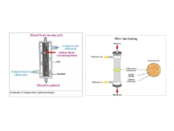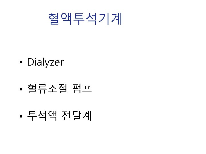 투석기 (dialyzer) • 모세섬유관 투석기 (hollow fiber dialyzer) : 가장 많이 사용됨 • 평행판 투석기 (parallel plate dialyzer)