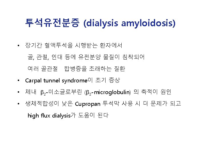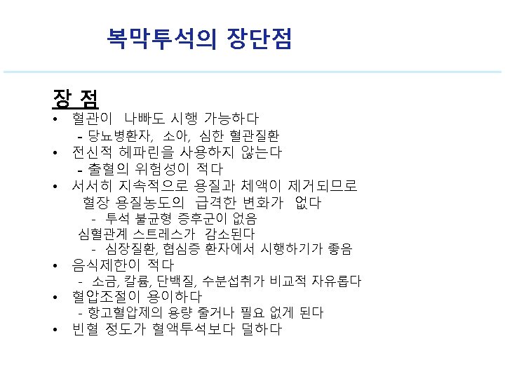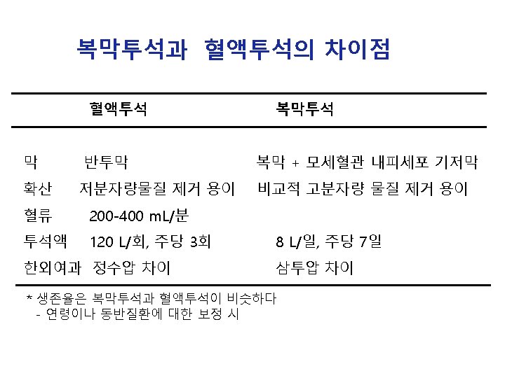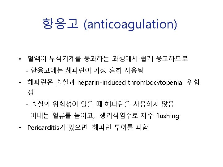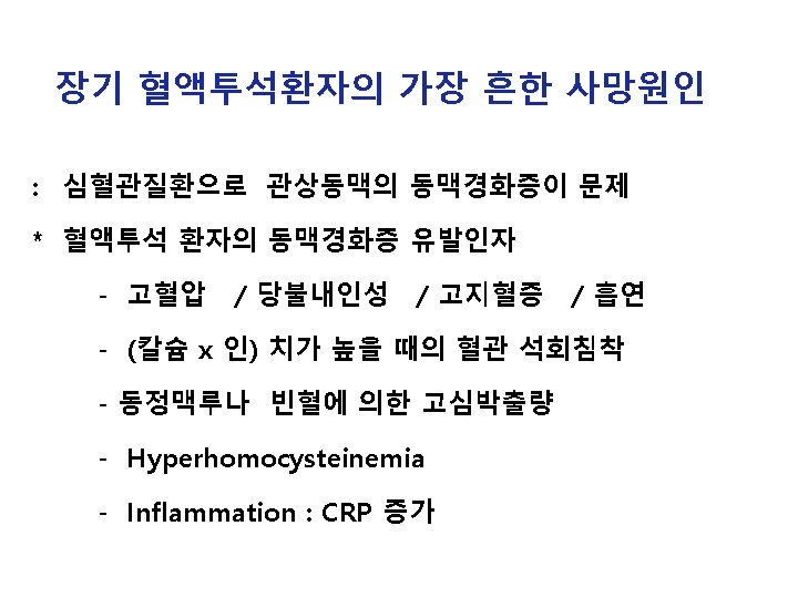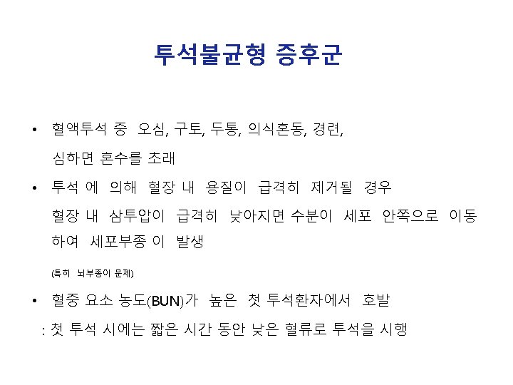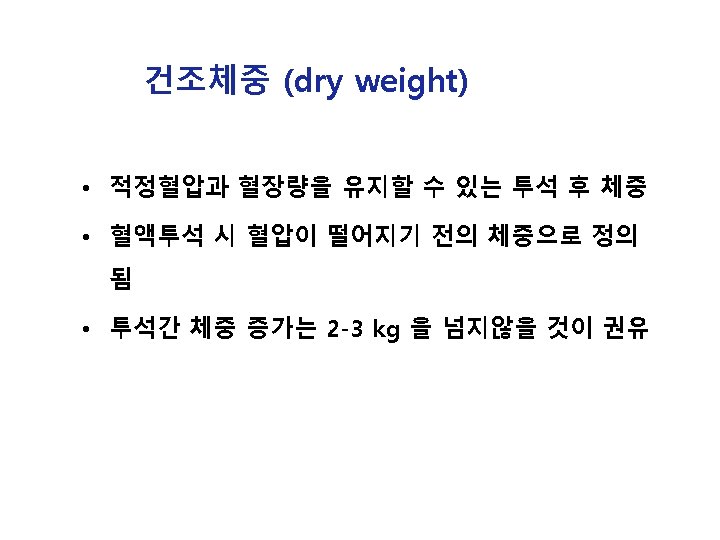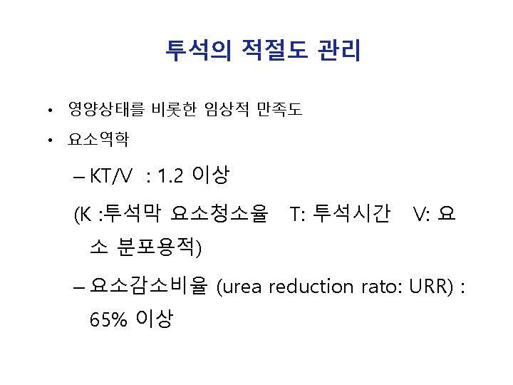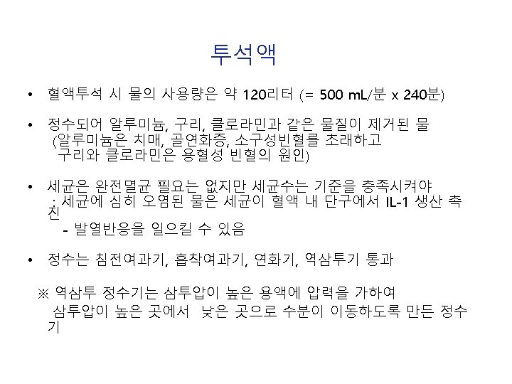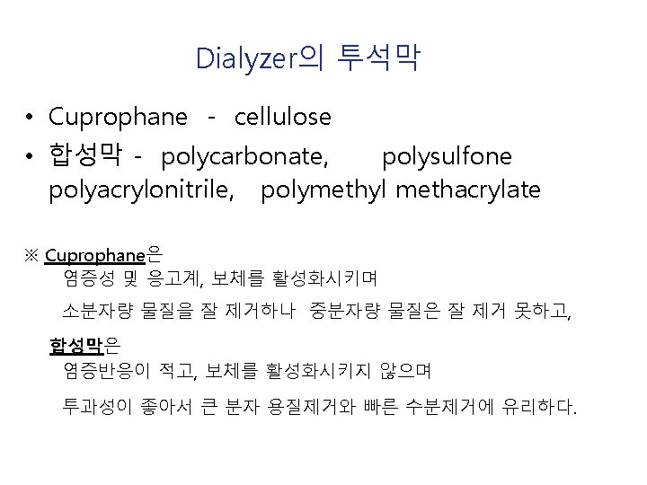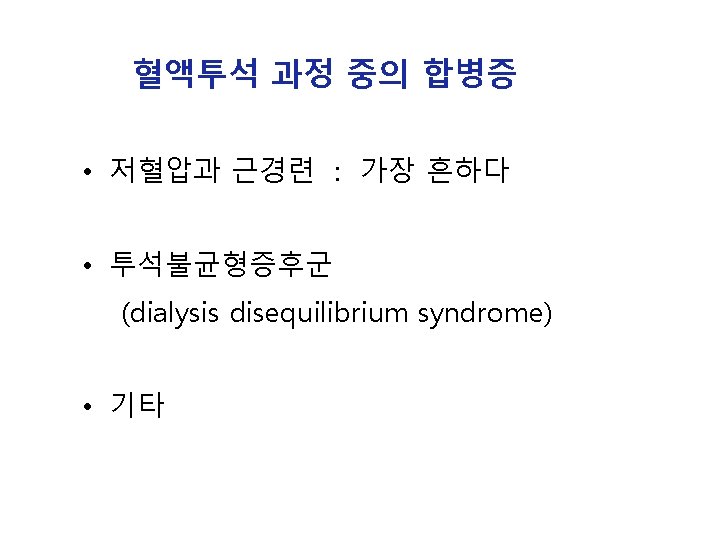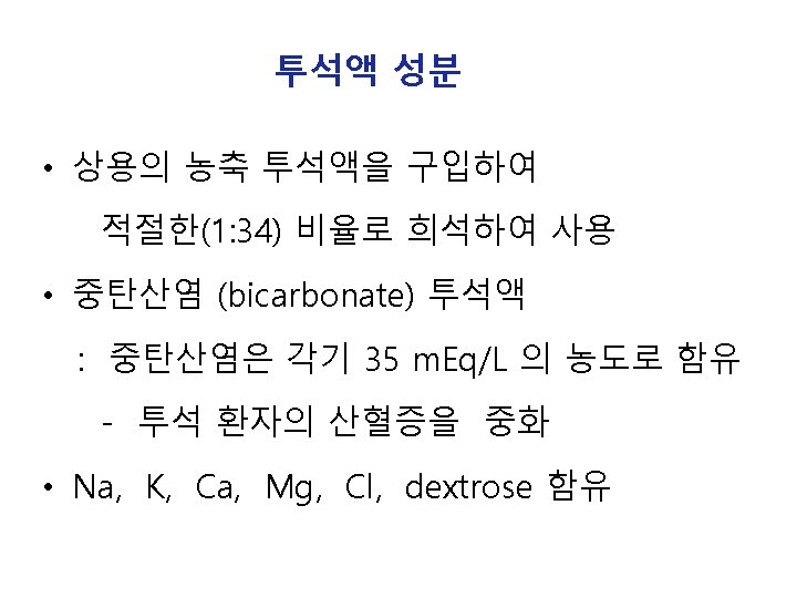 투석액의 조성과 합병증 • Na – Intradialytic symptom, interdialytic weight gain, hypertension • K – Sudden cardiac death, arrhythmia, hypertension, hypotension • Ca – CKD-MBD, vascular calcification • HCO 3 – CKD-MBD, nutrition • Mg – Cardiovascular event rates, arrhythmia • Glucose – Hypoglycemia during HD • Water – Aluminum, chloramine, bacteria, endotoxin