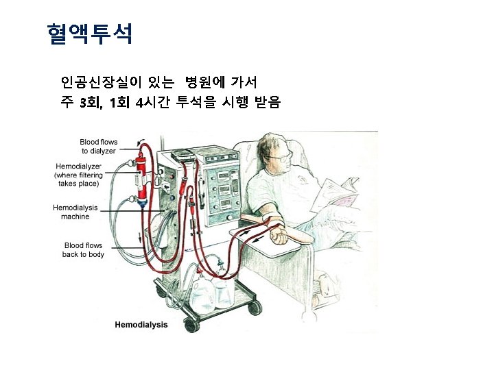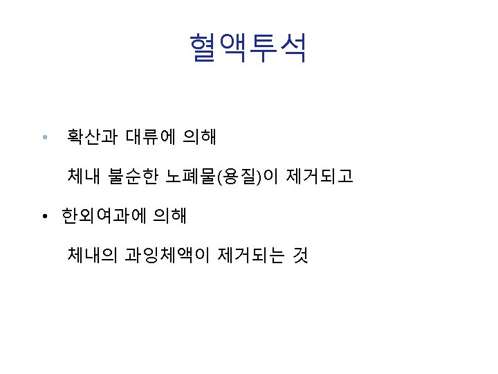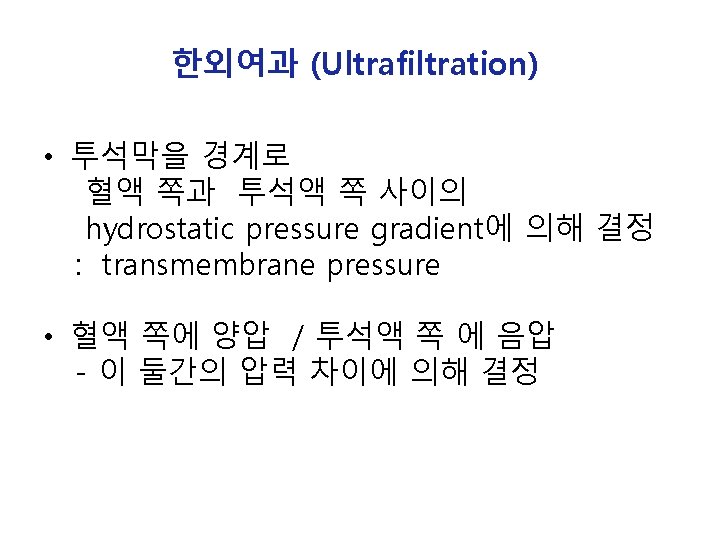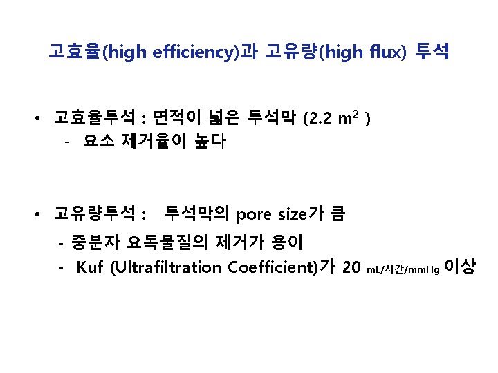 혈액투석의 기본원리 반투막을 경계로 Solute removal • 확산 (diffusion) • 대류 (convection) Fluid removal • 한외여과 (ultrafiltration) * Convection에 의한 용질의 제거는 일반 투석 시 에는 영향이 적으나 High flux dialysis 나 CVVH에서는 (contineous venous hemofiltration) 의미있는 역할을 한다.