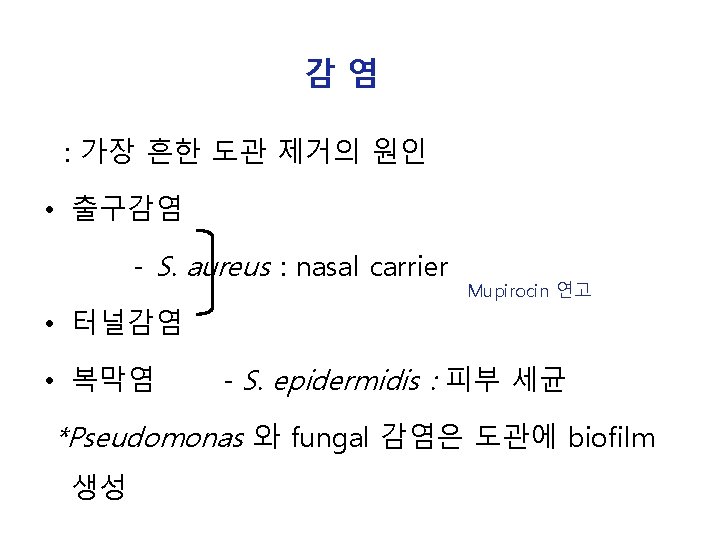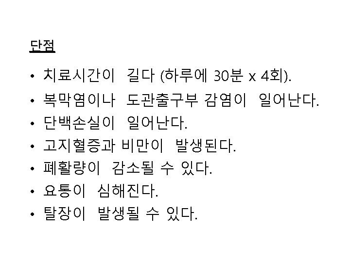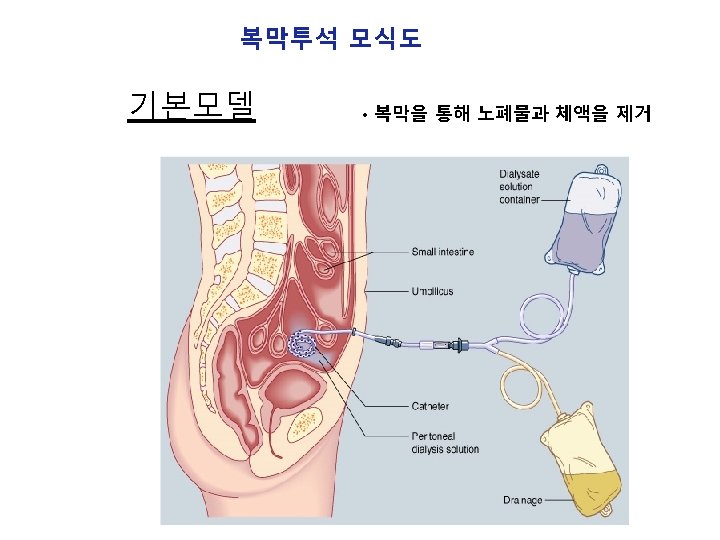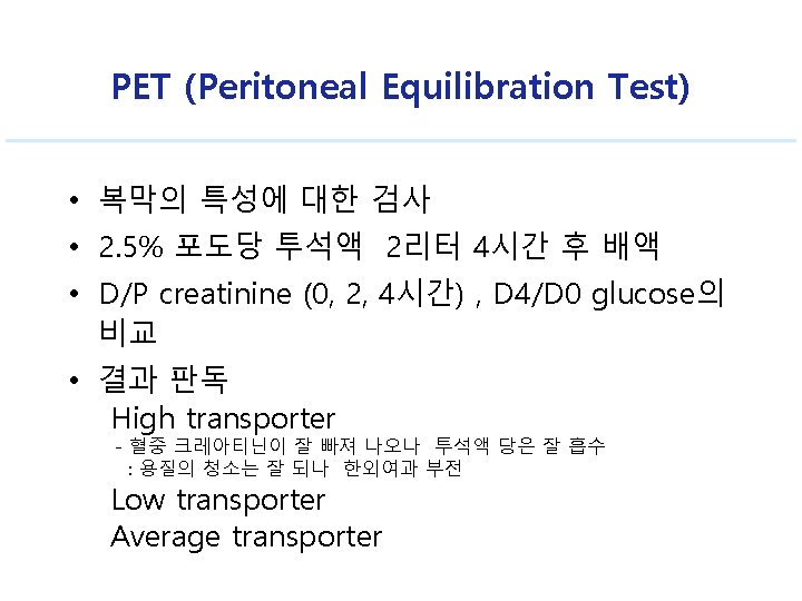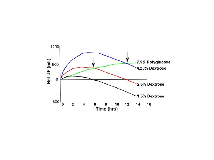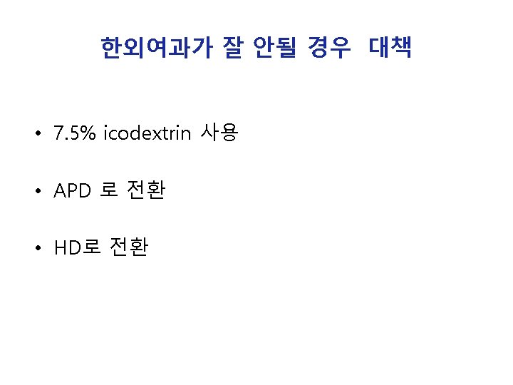 한외여과 장애 (Uf failure) • Small pore 증가 - 복막에서 혈액으로 glucuse 흡수 증가 : osmotic gradient 소실 • Lymphatic absorption • Aquaporin channel 소실 • 복강내 hydrostatic pressure 증가