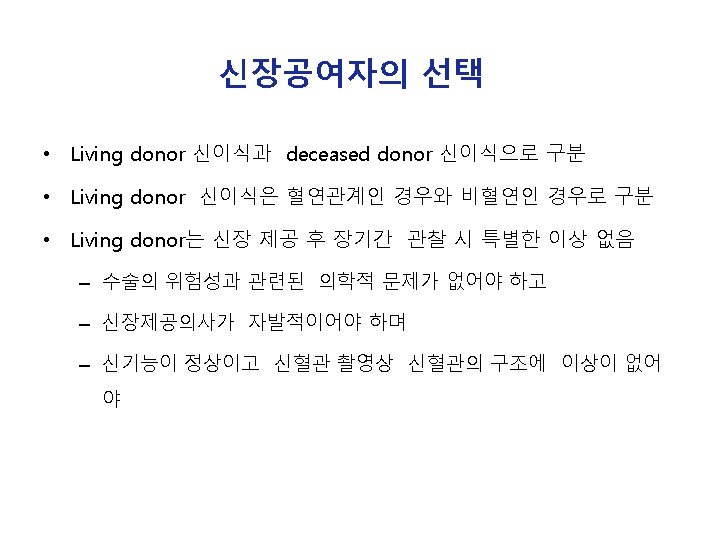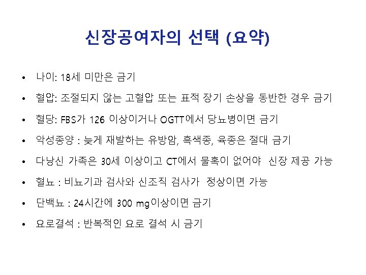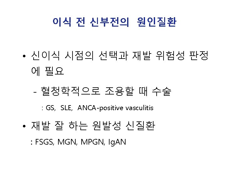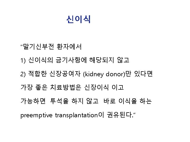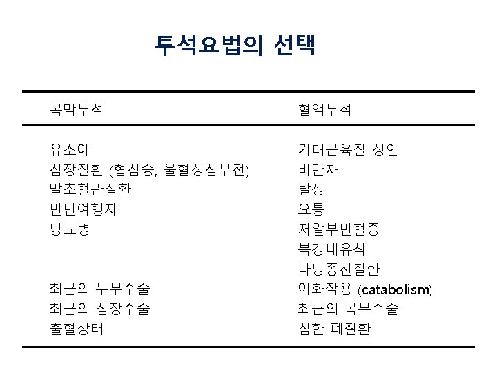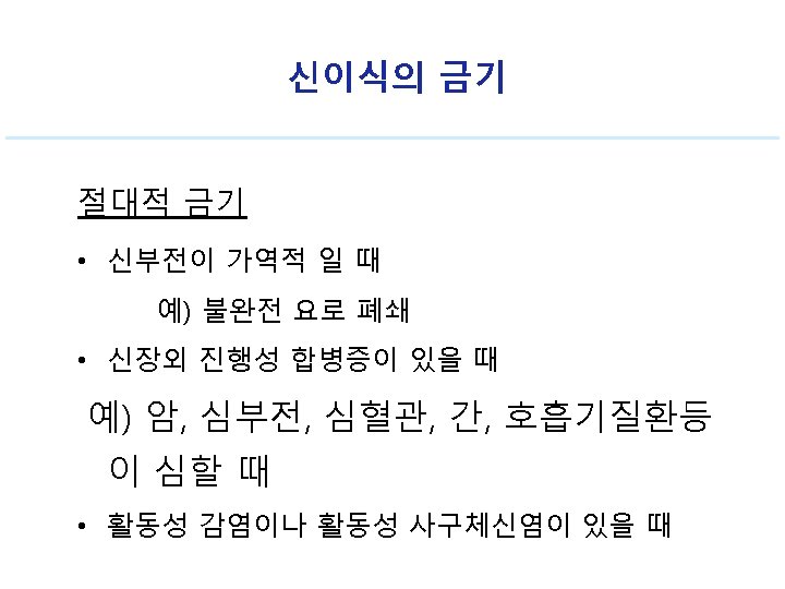 즉각 투석 시작의 적응증 Indications for prompt initiation of dialysis • Uremic pericarditis • Uremic encephalopathy • Intractable muscle cramping • Clinically significant bleeding diathesis • Persistent nausea and vomiting • Evidence of malnutrition • Refractory ECF volume overload • Refractory hyperkalemia