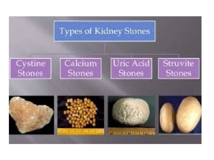 Uric acid lithiasis • 5 -10% of renal stones • Uric acid is end product of purine metabolism • Who take exessive purine content food will excrete more uric acid in urine • Uric acid remains undissociated and insoluble at PH <5. 5 • Low urine volume contribute to uric acid stone formation