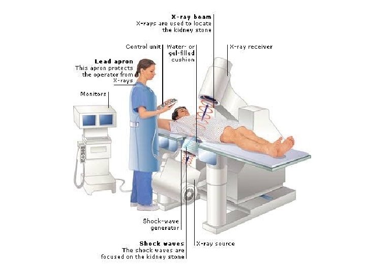 ESWL • Endoscopic shock wave lithotripsy • Piezo-electric or electromagnetic shock waves passed on stone through water bath or water cushion • Stone location confirmed by C-arm • 2 shocks per second • 1000 -4000 shocks required for each stone • Fragmented stone come out in urine
