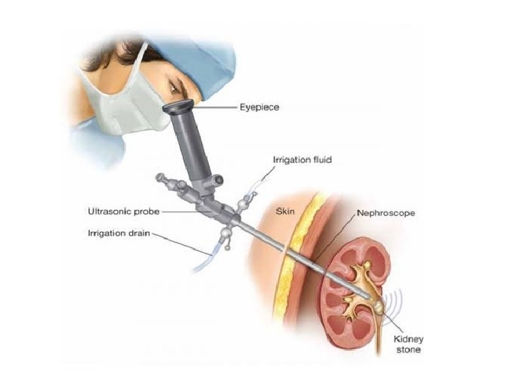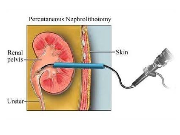 PCNL Through kidney , calyx and pelvis approached Will pass guide wire after needle puncture By using Graduated dilator track is widen NEPHROSCOPE is passed Will break stone by laser holmium, ultrasonic or electrohydraulic lithotripser • Size- 5 mm, 10 mm , 15 mm • • •