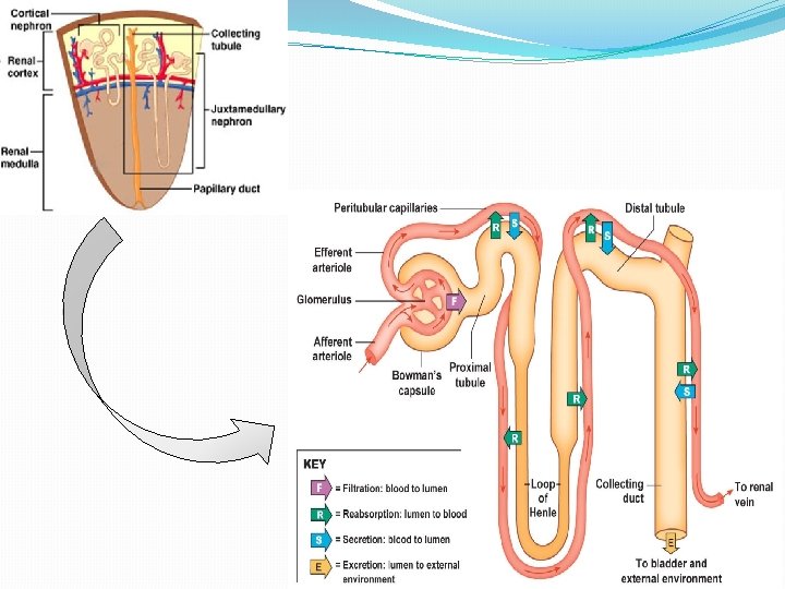 ü Then it enters into the Loop of Henle where all the rest of the water and salt are reabsorbed into the blood ü Then it enters into the Distal Convoluted tubule where remaining water and salt are reabsorbed. ü Then the waste products enters into the Collecting duct. ü From the collecting duct it passes through the renal pelvis & then to ureters into the urinary bladder. ü From the urinary bladder it is excreted through urethra.