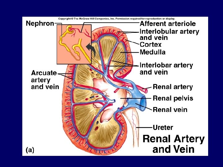 Blood Supply Aorta Renal Artery Peripheral Branches (interlobar, arcuate, interlobular arteries) Afferent Arteriole (takes blood to glomerulus) Glomerulus (ball of capillaries) Efferent Arteriole (takes blood away) Peritubular capillaries (vasa recta) Peripheral Branches (interlobular, arcuate, interlobar veins) Renal Vein Inferior Vena Cava