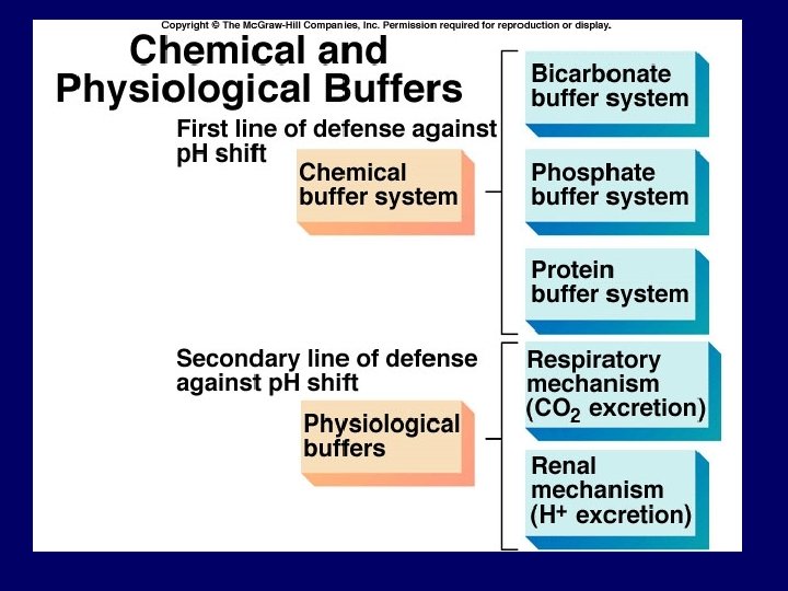 Regulation of blood p. H PHYSIOLOGICAL BUFFERS = 2 nd line of defense These buffer systems work when p. H changes lead to alkalosis or acidosis