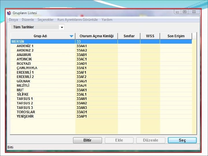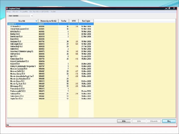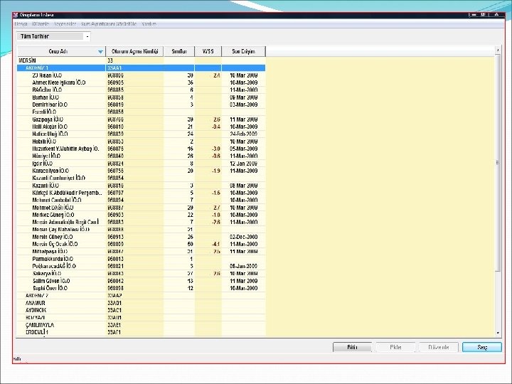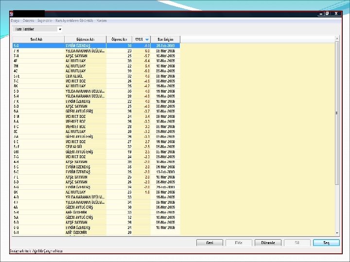 Gelen ekranda okullarımızın adları, Oturum açma kimliklerini -ki bunlar ayrıca okulların kurum kodlarıdır- , WSS yani Ağırlıklı Çalışma Notlarını ve Son erişim tarihlerini görüyoruz. Bu ekranda bu adların yazılı olduğu butonlara bastığımız taktirde istediğimiz sıralama ile ekranı yeniden şekillendirebiliriz…