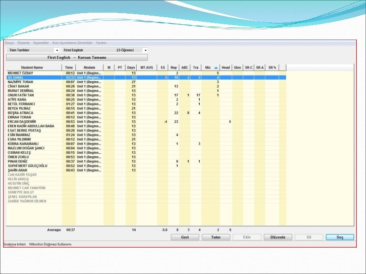 Bir başka sınıf ve başka bir öğrenciye baktığımızda öğrenci ve sınıf çalışmalarını değerlendirmede dikkat etmemiz gereken tuşları daha iyi görebiliriz. Asla unutmamamız gereken şey tabloyu kontrol ettiğimizde mikrofona konuşma sayısı kadar kulaklıktan dinleme ve tekrar tuşunun kullanım sayılarının aynı oranda olması yada daha fazla olması gerektiğidir….