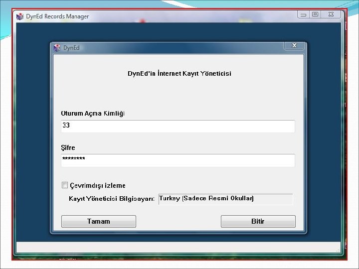 Öncelikle Dyn. Ed İnternet Kayıt Yöneticisi –’Records Manager’ çift tıklanarak açılır. İlgili yerlere sırası ile Oturum Açma Kimliği ve Şifre yazılır