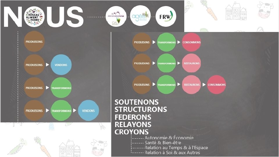 Rationalisation des couts en particulier logistique pour augmenter la marge des producteurs et maitriser le prix pour le consommateur Mettre en place une dynamique et un ou des projets structurants Susciter et accompagner les initiatives et les partenariats qui complètent l’offre et donner plus de valeur ajoutée Maitrise de la communication et promotion commune Reconnaissance et différenciation des Réseautage + accompagnement des producteurs + soutien aux projets innovants Renforcer la RATA V demande Compléter l’offre Faciliter la vente