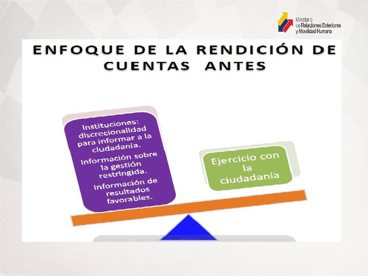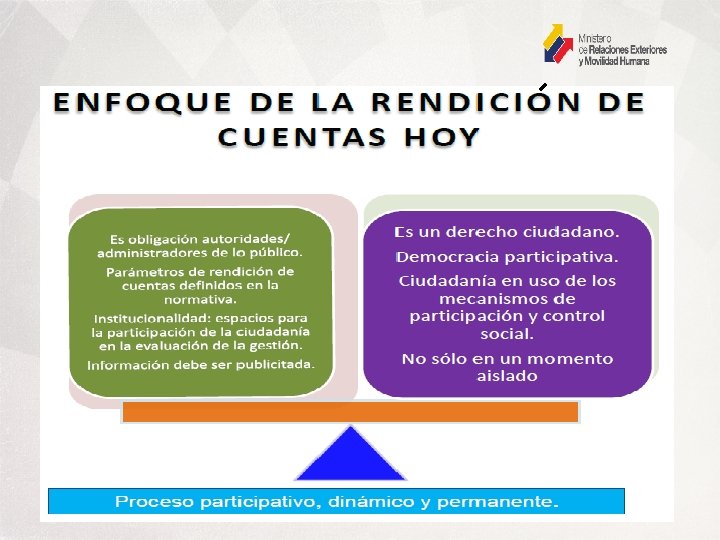 Rendición de Cuentas Ministerio de Relaciones Exteriores y Movilidad Humana DOMICILIO Provincia: Cantón: Parroquia: Dirección: Página web: Teléfonos: N. - RUC: Pichincha Quito La Mariscal Carrión E 1 -76 y Av. 10 de Agosto https: //www. cancilleria. gob. ec/ 593 -2 299 -3200 1760000820001 REPRESENTANTE LEGAL DE LA INSTITUCIÓN: Nombre del representante legal de la institución: Cargo del representante legal de la institución: Correo electrónico: Teléfonos: Ricardo Patiño Aroca Ministro de Relaciones Exteriores y Movilidad Humana http: //www. cancilleria. gob. ec/contactos-cancilleria/ 593 -2 299 -3200