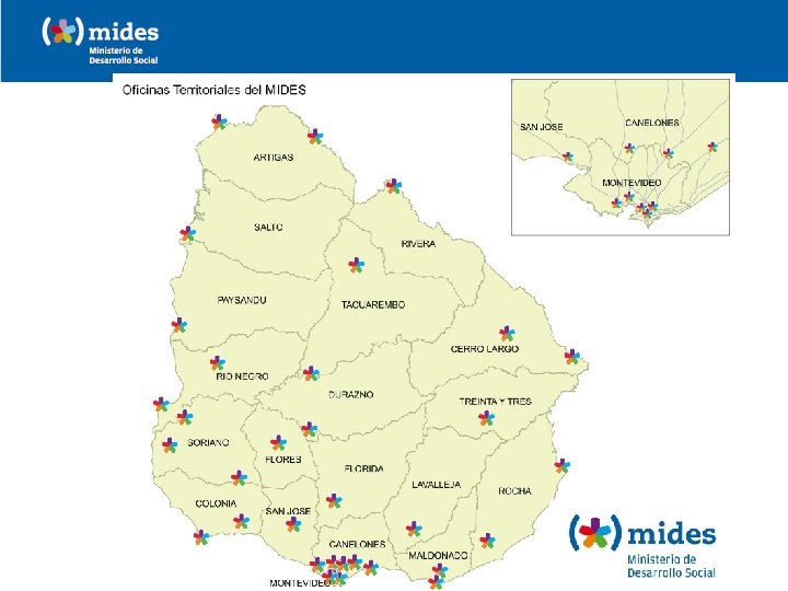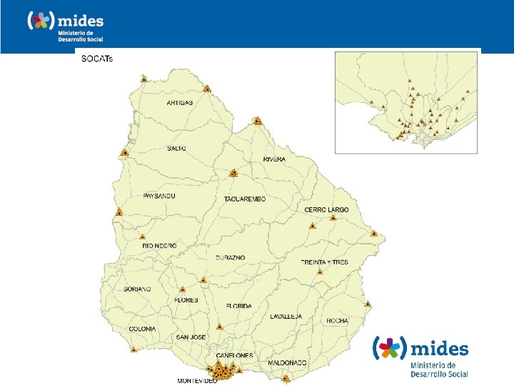 Gestión del territorio, atención a la ciudadanía y apoyo a los procesos de descentralización Se trabaja con el 85% de los Municipios, en distintos niveles que se expresan en diferentes articulaciones, reuniones de trabajo, eventos, participaciones: Primera aproximación a la vinculación con los Municipios: Artigas, Colonia, Rocha, Canelones, Cerro Largo, Río Branco, Paysandú, Soriano, Tacuarembó, Salto, Rivera, Florida, Río Negro, Maldonado, San José Lavalleja, Durazno, Montevideo.