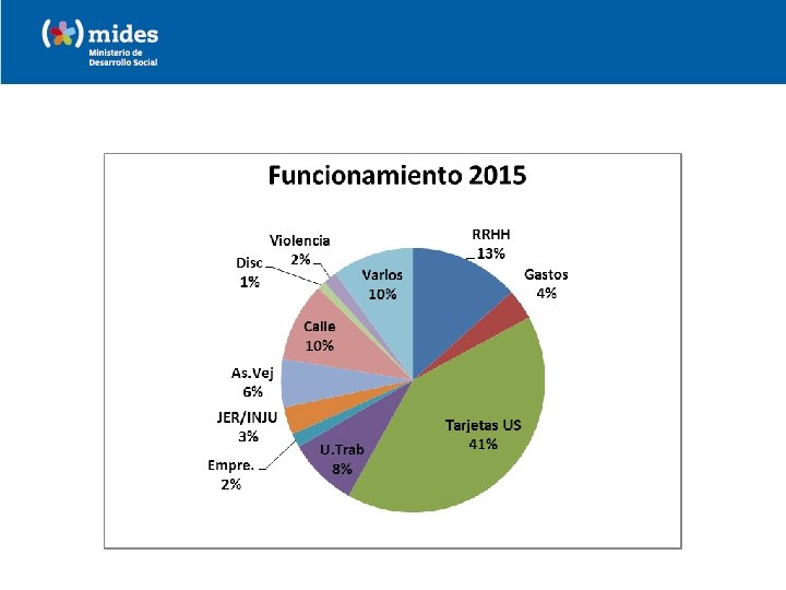 Cooperación: Cooperación tradicional: Se mantuvieron los apoyos del Sistema de Naciones Unidas, de la Agencia Española de Cooperación Internacional para el Desarrollo y del Banco Interamericano de Desarrollo y la Organización de Estados Americanos. Las políticas sociales apoyadas por estos fondos internacionales han sido aquellas referidas a las siguientes temáticas: primera infancia, cuidados, educación, trabajo, atención a las situaciones de vulnerabilidad, género, juventud, fortalecimiento institucional, diversidad sexual y afrodescendientes, territorio. Cooperación sur-sur: En el año 2015 se ha finalizado el proceso más importante que donde se logró un proceso muy exitoso de cooperación que involucró a casi todas las direcciones del MIDES contribuyendo al desarrollo institucional a través del: apoyo al diseño, gestión, monitoreo y evaluación de los programas sociales; fortalecimiento del programa de atención a personas en situación de calle; fortalecimiento del modelo de gestión territorial y apoyo al Sistema de Cuidados.