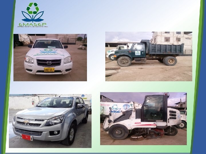 EQUIPOS Y MAQUINARIAS DE LA EMPRESA. • • 1 RETROEXCAVADORA KOMATSU WB 146 -5 1 TRACTOR CATERPILLAR D 6 K 1 TRACTOR AGRÍCOLA JOHN DEERE 5065 E 4 RECOLECTORES KENWORTH T 370 1 BARREDORA ELGIN PELICAN 1 VOLQUETE INTERNACIONAL 1 CAMIONETA BT-50 1 CAMIONETA CHEVROLET D-MAX
