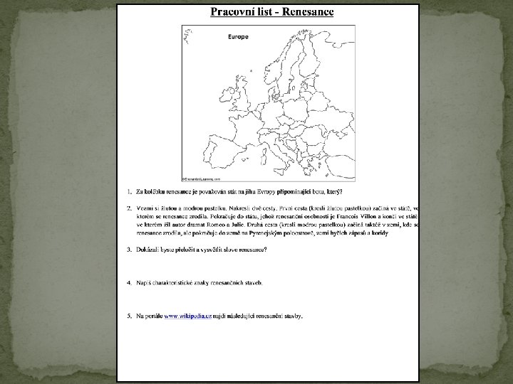Práce s mapou � Vezmi si žlutou a modrou pastelku. Nakresli dvě cesty. První cesta (kresli žlutou pastelkou) začíná ve státě, ve kterém se renesance zrodila. Pokračuje do státu, jehož renesanční osobností je Francois Villon a končí ve státě, ve kterém žil autor dramat Romeo a Julie. Druhá cesta (kresli modrou pastelkou) začíná taktéž v zemi, kde se renesance zrodila, ale pokračuje do země na Pyrenejským poloostrově, zemi býčích zápasů a koridy. � Za kolébku renesance je považován stát na jihu Evropy připomínající botu, který?