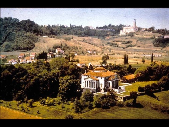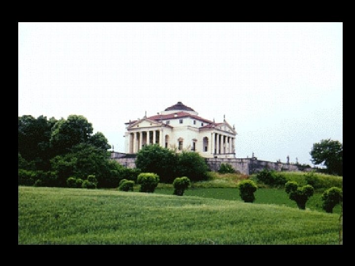 Antik templom homlokzat a világi épületen • Vicenza mellett van • Az oszlopos, timpanonos kapuzat (portikusz) villáinak közös jellemzője • Itt ión oszlopok vannak • Az épület minden oldalról ugyanolyan • Az oszlopcsarnok összeköti az épületbelsőt a kertel