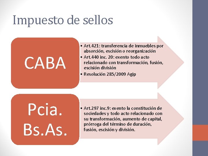 Impuesto de sellos CABA Pcia. Bs. As. • Art. 421: transferencia de inmuebles por absorción, escisión o reorganización • Art. 440 inc. 20: exento todo acto relacionado con transformación, fusión, escisión división • Resolución 285/2009 Agip • Art. 297 inc. 9: exento la constitución de sociedades y todo acto relacionado con su transformación, aumento de capital, prórroga del término de duración, fusión, escisión y división.