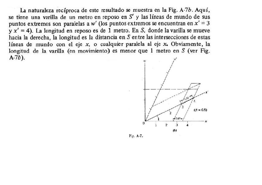 Dilatación del tiempo medido por relojes en movimiento Para demostrar geométricamente el resultado de la dilatación del tiempo consideremos a la Fig. A-8. Se supone un reloj en reposo en el sistema S, dando el tiempo ahí. La línea continua vertical en la Fig. A-8, en x = 2. 3, es la línea de mundo correspondiente a tal reloj. T 1 y T 2 son los eventos transcurridos en w (= ct) = 2 y w (= ct) = 3, siendo igual a uno el intervalo de tiempo en S entre dichos eventos. En S', este reloj se encuentra en movimiento hacia la izquierda de modo que los eventos de dar la hora se suceden en lugares distintos. Para medir el intervalo de tiempo entre los eventos T 1 y T 2 en S', se usan dos relojes diferentes, uno situado en el lugar de T 1 y el otro en el lugar de T 2. La diferencia en lecturas de estos relojes en S' es la diferencia en el tiempo entre T 1 y T 2 medidos en S'. A partir de la gráfica, se nota que este intervalo es mayor que la unidad. Por consiguiente, desde el punto de vista de S', el reloj en movimiento parece marchar más lentamente. Durante el intervalo que el reloj S registró la unidad de tiempo, el reloj S' registró un tiempo mayor que la unidad. Finalmente, la naturaleza recíproca del resultado de la dilatación del tiempo se muestra también en la Fig. A-8. El estudiante debe proponer un razonamiento detallado. Aquí un reloj en reposo en S' emite señales en U 1 y U 2 separados por la unidad de tiempo propio. Al medirse en S, el intervalo correspondiente de tiempo excede la unidad.