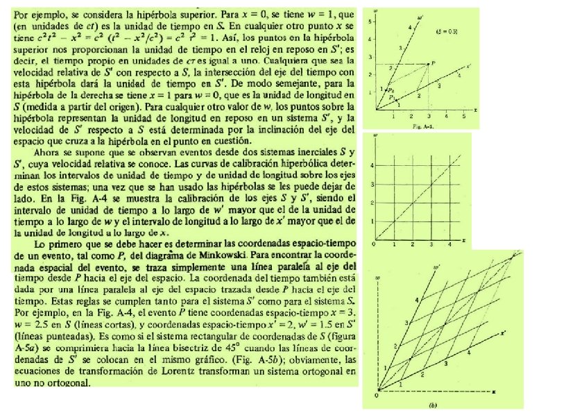 Para representar la situación geométricamente, se comienza trazando los ejes x y w del sistema S perpendiculares entre sí. Si se desea representar el movimiento de una partícula en este sistema, se traza una curva, denominada línea de mundo, que da· el lugar geométrico de los puntos espacio-tiempo correspondientes al movimiento. La tangente a la línea de mundo en cualquier punto, es está inclinada con respecto al eje del tiempo en un ángulo que es menor de 45°. Ello se debe a que este ángulo está La línea de mundo de un pulso de luz, para la cual u = c es una recta a 45° con los ejes. Se considera ahora el sistema (S') que se mueve con respecto a S, desplazándose a una velocidad v a lo largo del eje común x -x'. La ecuación de movimiento de S' con respecto a S puede obtenerse haciendo x' = 0 (lo cual localiza el origen de S'); de la ecuación para x’, tenemos que esto corresponde a x = bw (= vt). Se traza la línea x' =0 (es decir x = bw ) en el diagrama de la derecha y considerando que v < c y (b < 1, el ángulo que esta línea forma con el w, f = arctg (b), es menor que 45°. Del mismo modo que el eje w corresponde a x = 0 y es el eje del tiempo en el sistema S, así la línea x' = 0 da el eje del tiempo w' en S'. De la ecuación para w’, w' = 0 significa que w = bx es la ecuación de este eje en el diagrama w - x Es fácil demostrar que el ángulo entre los ejes espaciales es el mismo que el de los ejes temporales, f = arctg (b).