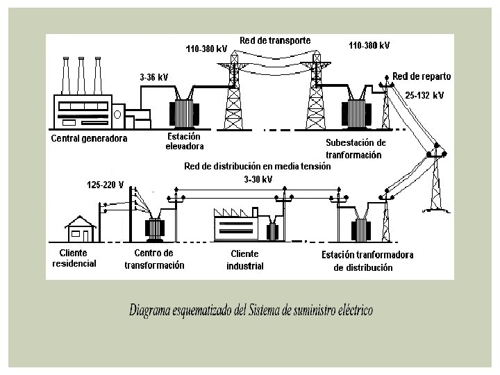 Monofásico – utilizado para residencia y comercios pequeños Trifásico – utilizados en grandes comercios y plantas industriales Transformador – reducen los voltajes de distribución 240 V / 120 V Sistema de suminitro eléctrico - siempre comprende el conjunto de medios y elementos útiles para la generación, el transporte y la distribución de la energía eléctrica. Este conjunto está dotado de mecanismos de control, seguridad y protección Generación – donde se produce la electricidad (Centrales Eléctricas) Transporte - es la encargada de enlazar las centrales con los puntos de utilización de energía eléctrica Subestación - son plantas transformadoras que se encuentran junto a las centrales generadoras y en la periferia de las diversas zonas de consumo, enlazadas entre ellas por la Red de Transporte