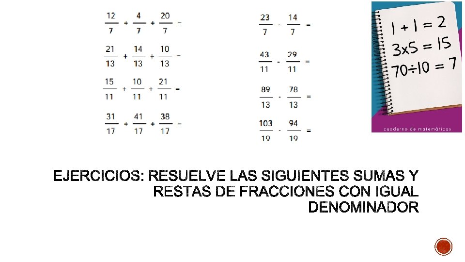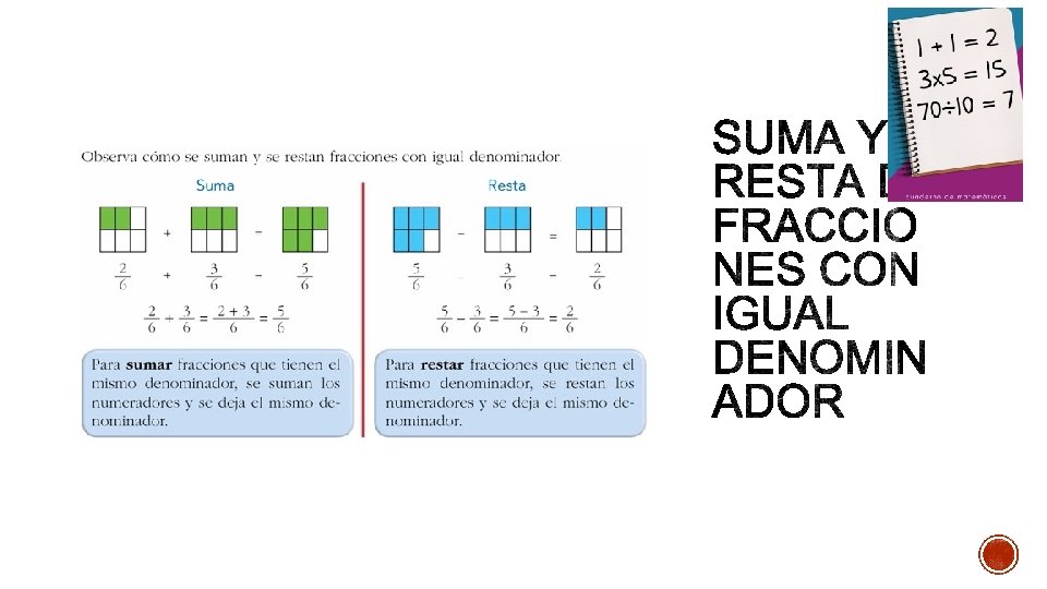 § COMO SE PUEDE EJEMPLO 2: OBSERVAR EN LOS EJEMPLOS DEL LADO IZQUIERDO, EN LA SUMA DE FRACCIONES CON IGUAL DENOMINADOR, SE DEBE CONSERVAR EL DENOMINADOR, Y SUMAR LOS NUMERADORES