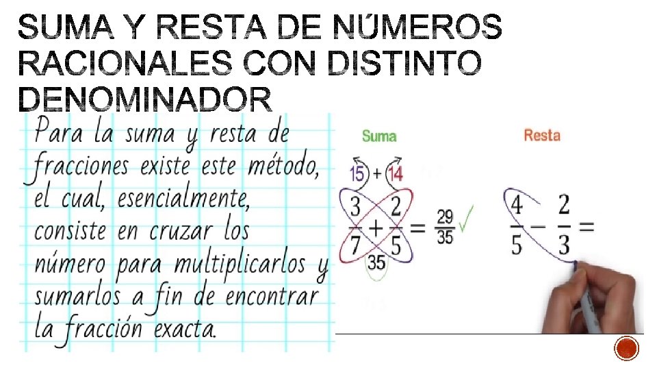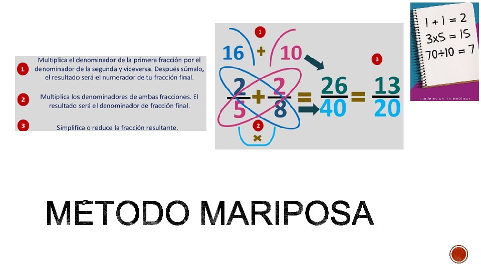 PARA EL PRIMER EJEMPLO: Paso 1: Multiplique 2 x 8=16 Paso 2: Multiplique 3 x 5=15 Paso 3: Multiplique 5 x 8=40 Luego se suman los valores obtenidos en el paso 1 y 2, y son divididos por el valor obtenido en el paso 3 (multiplicación de los denominadores).