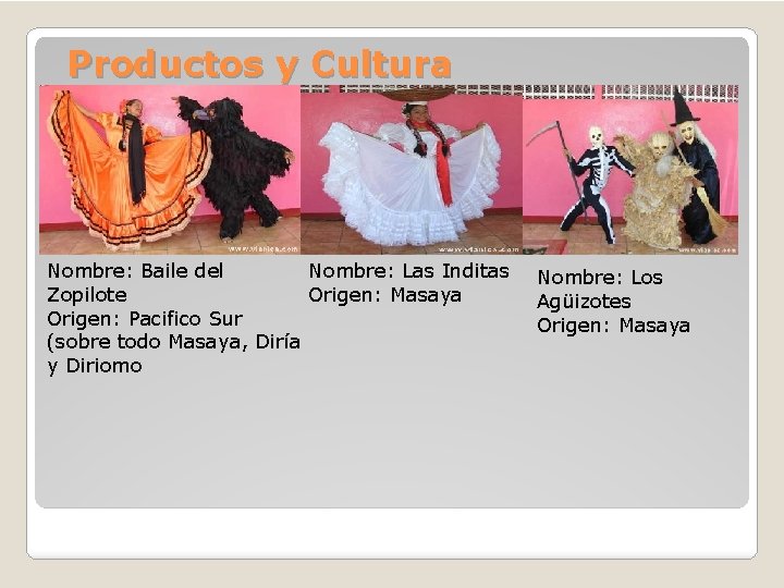 Productos y Cultura Nombre: Baile del Nombre: Las Inditas Zopilote Origen: Masaya Origen: Pacifico Sur (sobre todo Masaya, Diría y Diriomo Nombre: Los Agüizotes Origen: Masaya