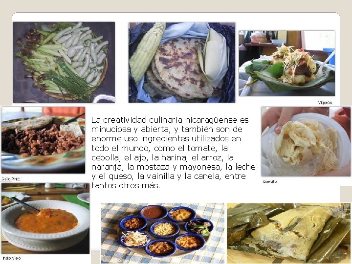 La creatividad culinaria nicaragüense es minuciosa y abierta, y también son de enorme uso ingredientes utilizados en todo el mundo, como el tomate, la cebolla, el ajo, la harina, el arroz, la naranja, la mostaza y mayonesa, la leche y el queso, la vainilla y la canela, entre tantos otros más.