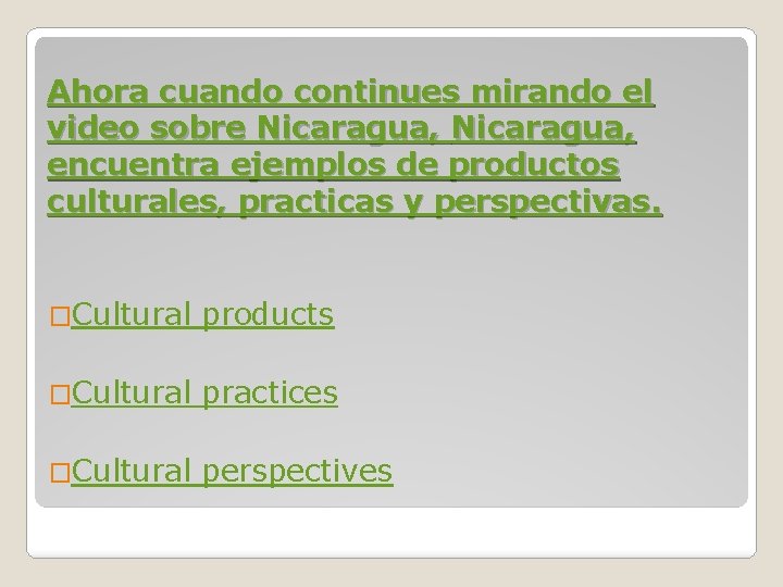 Ahora cuando continues mirando el video sobre Nicaragua, encuentra ejemplos de productos culturales, practicas y perspectivas. �Cultural products �Cultural practices �Cultural perspectives