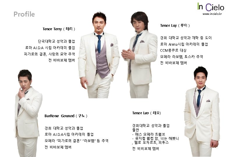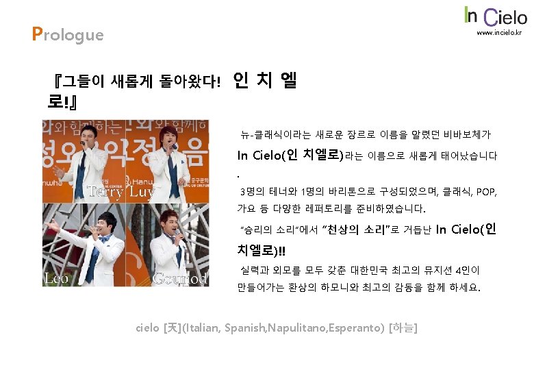 Repertory In Cielo Classic MR - Nessun Dorma (공주는 잠 못 이루고) Una Furtiva lagrima (남몰래 흘리는 눈물) Votre Toast (투우사의 노래) E lucevan le stelle (별은 빛나건만) O Sole mio (오 나의 태양) Tristezz (이별의 노래) Granada (그라나다) La donna e mobile (여자의 마음은) In Cielo Classic Piano - Ave maria by Gounod (구노의 아베마리아) Ave maria by Caccini (카치니의 아베마리아) Torna a Surriento (돌아오라 소렌토로) Ave maria by mascagni (마스카니의 아베마리아) Panis Angelicus (생명의 양식) Funiculli Funiculla (푸니쿨리 푸니쿨라) Dein ist mein ganzes Herz (그대는 진정 나의 마음) Ich liebe dich (그대를 사랑해) Core n’grato (무정한 마음) Ombra mai fu (나무 그늘 아래서) In Cielo Pop MR - Regresa a mi(Un break my heart) Nella Fantasia You raise me up My way Can’t help falling in love solo otra vez(All by my self) Oh! Happy day! The prayer The impossible dream This is the moment tonight www. incielo. kr In Cielo Pop PIANO - Moon River - Perhaps Love - You are so beautiful In Cielo Korean MR - 향수 - 거위의 꿈 - 지금 이 순간 In Cielo Korean PIANO - 보리밭 - 아리랑 - 한국가곡 다수 In Cielo 성가 - The Lord’s prayer (주기도문) 너는 내 아들이라 이 산지를 내게 주소서 주님 내가 여기 있사오니 내가 주님을 내가 천사의 말 한다 해도 하나님의 은혜 사명 축복하노라 The Holy city (거룩한 성) In Cielo Christmas - The white Christmas - O holy night