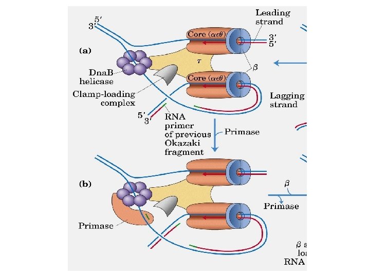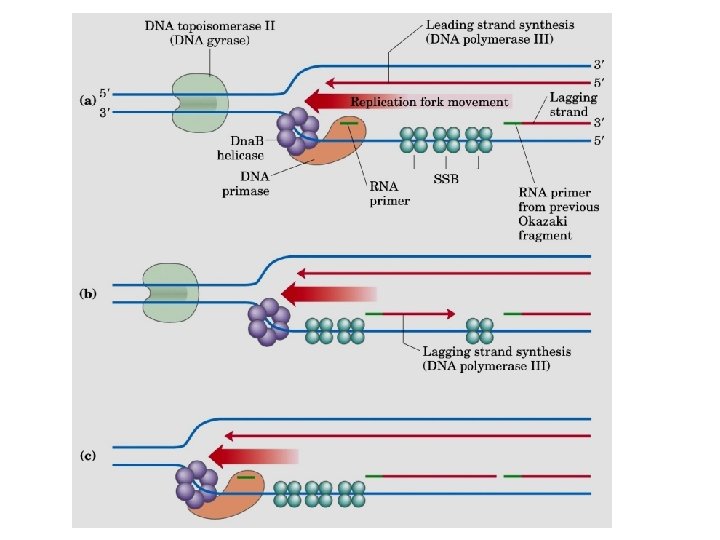Fragmentos de Okasaki ocorrem na fita descontínua A DNA polimerase III é responsável pela síntese da maior parte do DNA A DNA polimerase I remove o primer de RNA e preenche as lacunas A DNA ligase sela as quebras