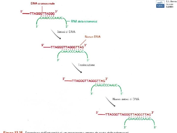 La telomerasi estende l’estremita’ sporgente Quando e’ stato sintetizzato sufficiente DNA, puo’ essere innescato un nuovo Frammento di Okazaki