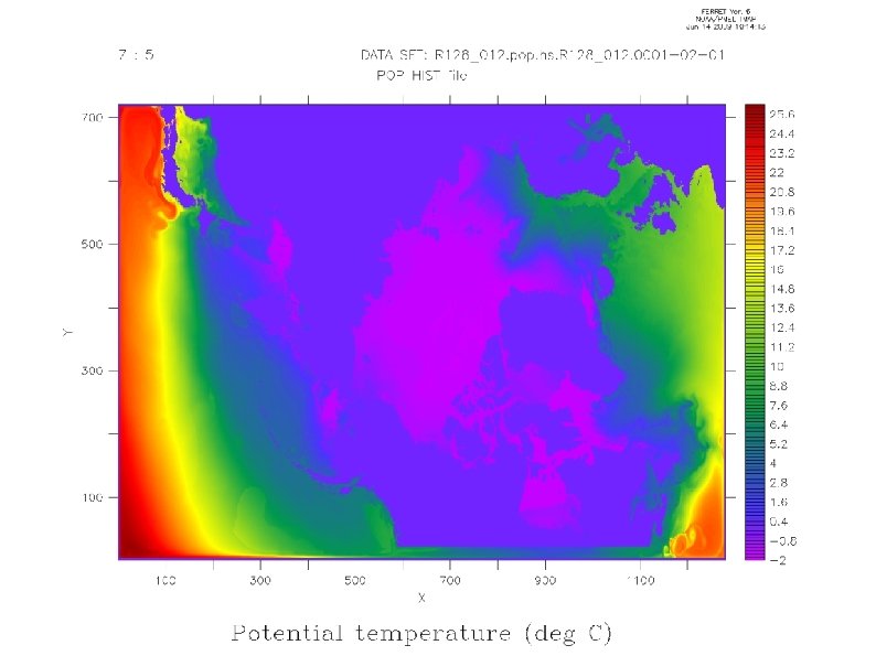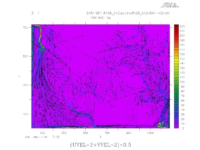 Negative ice area appered. The winds was dumped (for one year). Before dumping winds it worked only for 15 days. After dumping winds the model stopped after about 30 days. In module ocn_comp_mct. F 90 main routines to hold extended grid were added. Also, option 'cpl_grid_file' in pop 2_in was added and the model was tested with normal and extended grid. In extended grid there are zeros everywhere (Tony) New release (02 and 03) was prepared (Tony) and tested. It consist of new datasets (for datm model). Works fine, but only 9 days. Models fail because of kinetic energy (> 100, POP). It suggests that some technical and parametrization problems has been fixed (this error is better then negative ice area).