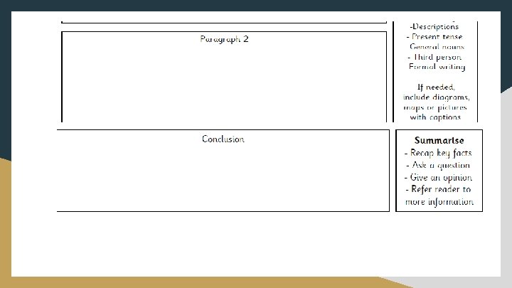 Layout of Information Report Writing Title What subject will your report be about? Opening Statement Give a general description of your subject. Description Describe your subject using lots of detail and include lots of interesting facts. You might use sub-headings here to organise what you are writing. Summary Finish up with a concluding sentence, or interesting fact.
