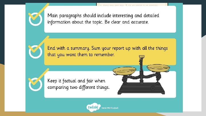 This Week’s Task: (4 th May – 8 th May) Using your Report Plan from last week’s task – Can you write and complete a full report? Ticking off your plan is a good idea, and makes sure you do not forget important information in your report. Try to include more detail than you can see in your plan – this will make your report more interesting. Use the layout in Slide 6 and 7 for help on how to lay out your report. If you have completed a report already, why not try to plan another? You are welcome to write about any subject that pleases you! A good idea might be to pick a country, animal or sport to write a report about.