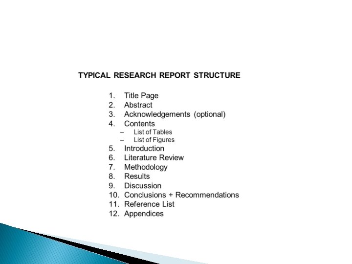 A research report � Research papers are organized so that the information flow resembles an hourglass in that it goes from general to specific and then back to general again. The introduction and literature review sections will introduce the problem and provide general information. The methods and results will provide specific, detailed information about this research project and the discussion/conclusion will discuss the findings in a larger context. Broadly a research report has: Prefatory parts � Text � Supplementary parts � Appended parts �