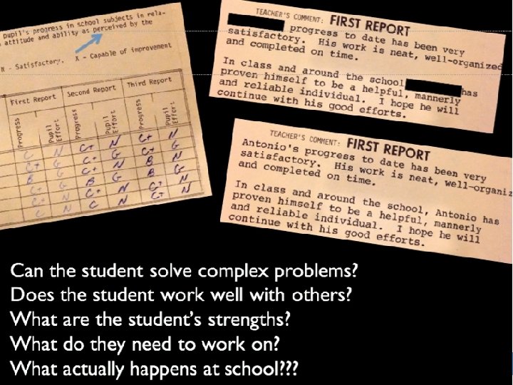 What decades of research tells us: 1. Grades tend to diminish students’ interest in whatever they are learning 2. Grades create a preference for the easiest possible task 3. Grades tend to reduce the quality of students’ thinking