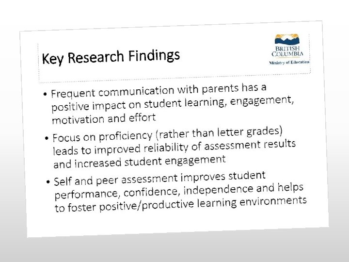 A shift from primarily focussing on summative assessment to focussing on formative assessment: • Part of the redesigned BC Curriculum • Ongoing personal feedback embedded in daily instruction and examples of student work are more critical to supporting student learning than simply reporting on student results. • The communication is based on clear standards and expectations and is intended to make learning visible.